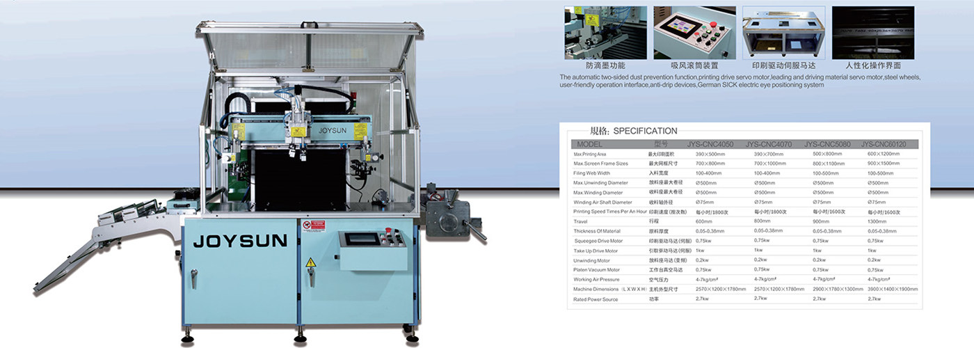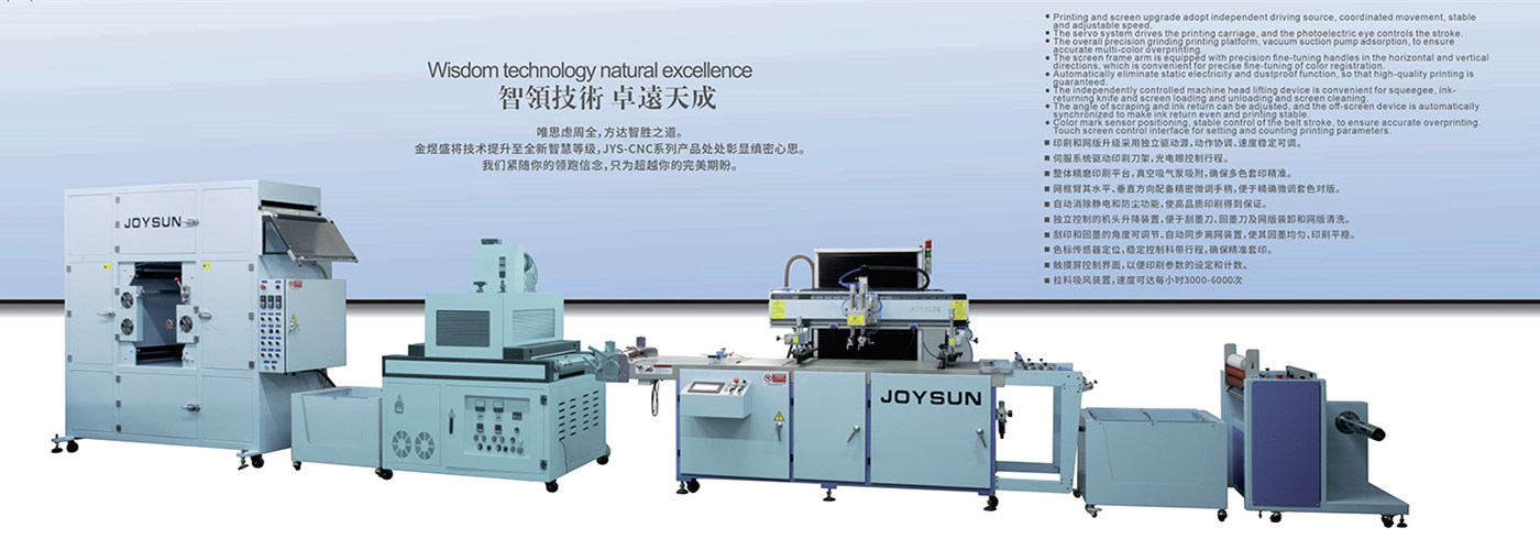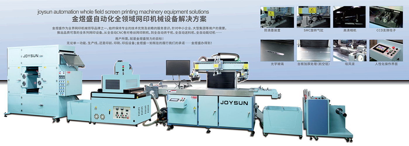 公司介紹:深圳市金煜盛網印科技有限公司是一家集研發、生產、銷售、技術支持為一體的生產商,專業制造全自動絲網印刷機,全自動絲印機,全自動網印機,全自動卷對卷絲印機,全自動卷對卷網印機,產品主要適用范圍為:PET、PVC、PC、B0PP薄膜等各種卷裝材料之網版印刷;適用于不干膠、轉印紙、特多龍、自粘商標紙,標簽銘牌銘板、薄膜開關和表面上光上色、IMD、IML、等各種卷裝材料。
